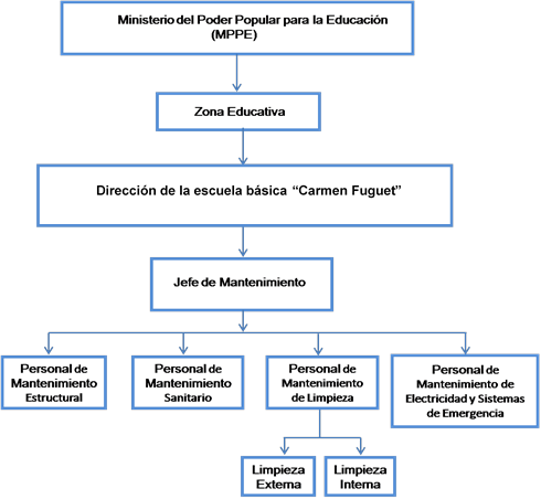 Esta estructura organizativa dependerá directamente del Ministerio del Poder Popular para la Educación (MPPE), el cual es el ente encargado de fijar los lineamientos para implementar las políticas y directrices para la gestión del mantenimiento en los centros educativos, la Dirección de la escuela básica “Carmen Fuguet” y el Jefe de la Unidad de Mantenimiento, el cual tendrá a su cargo la coordinación del personal de mantenimiento que serán las encargadas de ejecutar cada una de las actividades de mantenimiento de la institución.