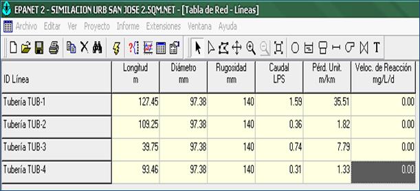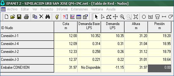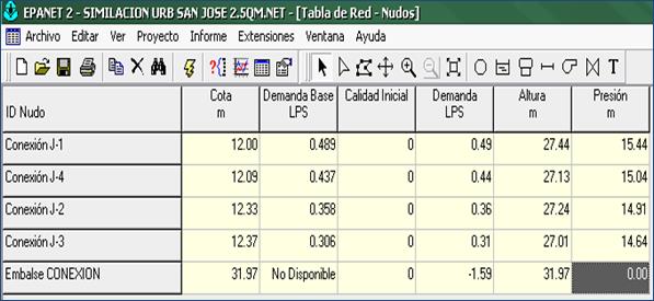 Como método de evaluación se trabajó con Software Epanet 2.0 español; el cual es desarrollado por la EPA (US EnviromentalProtection Agency) para el análisis de sistemas de distribución de agua potable. Aunque en general puede ser utilizado para el análisis de cualquier fluido no compresible con flujo a presión. El programa permite realizar el análisis hidráulico de redes de tuberías a partir de las características físicas de las tuberías y obtener la presión y los caudales en nodos y tuberías respectivamente. Adicionalmente, Epanet permite el análisis de calidad de agua a través del cual es posible determinar el tiempo de viaje del fluido desde las fuentes (tanques o embalses), hasta los nodos del sistema. Entre los elementos que puede simular el programa se encuentran fundamentalmente tubos, nodos y embalses (fuentes de cabeza fija) y adicionalmente permite utilizar elementos más complejos como bombas y válvulas.