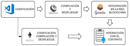 Para la construcción del smart contract que cumpla con las especificaciones funcionales se realiza la selección de herramientas tecnológicas y se define un proceso a seguir que se lo puede visualizar en la figura 4, en donde el primer paso es codificar en visual studio code el contrato inteligente en base a los requerimientos planteados, el siguiente paso será compilarlo y desplegarlo sustentándose en la herramienta truffle para después integrarlo a la red Ethereum de prueba en conjunto con el software Ganache y finalmente se pueda interactuar con el contrato inteligente con la ayuda de las herramientas mencionadas.