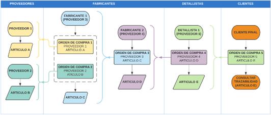 Uno de los factores importantes a estudiar es la trazabilidad de un artículo a través de la cadena de suministro, por tanto, para este análisis es necesario plantear en un entorno virtual un modelo de cadena de suministro basado en tecnología blockchain que simule la interacción de los copartícipes en la vida real. Este modelo se lo puede observar en la figura 3.