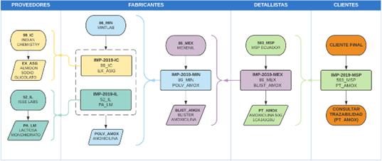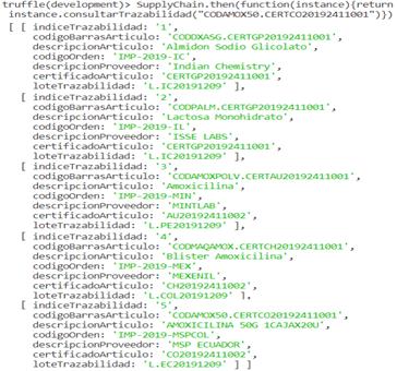 Como resultado se obtendrá toda la información como: artículos, proveedores y órdenes, que se presenta acorde al orden que fue interactuando en la cadena de suministro. La trazabilidad del artículo Amoxicilina 50 mg 1 caja por 20 unidades se lo puede observar en la figura 8.