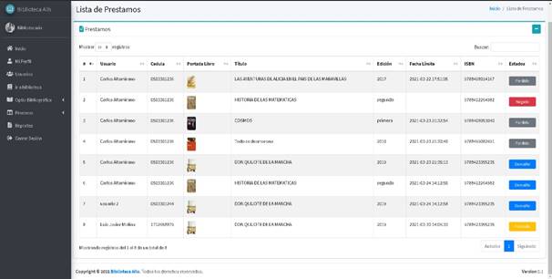 A continuación, se muestra la lista y los reportes de préstamo de un libro en particular: