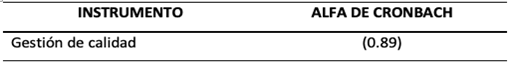 La confiabilidad del instrumento fue a través del Alfa de Cronbach (α¨) y la validez por juicio de expertos. Se realizó una prueba piloto, además sirvió, para probar los tiempos en resolver las encuestas. En la tabla 2 instrumento I (Gestión de calidad) encontramos los resultados respecto a la prueba de confiabilidad; el coeficiente de Alfa de Cronbach (α) es de 0,89 apreciando el grado de fiabilidad como adecuada.