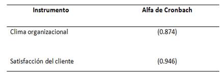 La confiabilidad del instrumento fue a través del Alfa de Cronbach (α¨) y la validez por juicio de expertos. Se realizó una prueba piloto, además sirvió, para probar los tiempos en resolver las encuestas. En la tabla 2, el instrumento 1, Clima Organizacional encontramos los resultados respecto a la prueba de confiabilidad; el coeficiente de Alfa de Cronbach (α) es de 0,874 apreciando el grado de fiabilidad como adecuada. En el instrumento 2, Satisfacción del Cliente encontramos los resultados respecto a la prueba de confiabilidad; el coeficiente de Alfa de Cronbach (α) es de 0,946 considerando al instrumento de poseer una fiabilidad adecuada.