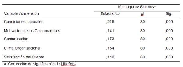 Continuando con el proceso de la investigación se efectúa la prueba de correlación de Kolmogorov-Smirnova debido a que las variables son cuantitativas y para fines de operacionalización han sido trabajadas en escala de Likert para frecuencia y puntajes. No se puede asumir la existencia de distribución normal en el conjunto de los datos obtenido.