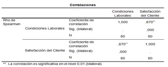 Tabla 14. Correlación condiciones laborales y satisfacción del cliente