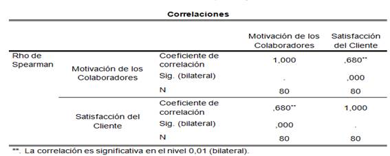 Tabla 15. Correlación motivación de los colaboradores y satisfacción del cliente