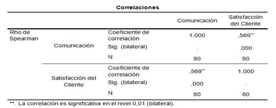 La comunicación si se relaciona con la satisfacción del cliente en la empresa Ozonomedica La Molina, 2021. Logrando demostrar una correlación modera de 0,569. Debido a que los colaboradores indican que casi siempre la comunicación dentro de la organización se difunde, esto genera que se tenga conocimiento de las actividades que se les realiza a los clientes que recurren al centro estético a realizarse servicios de belleza.