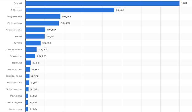 Figura 2. Número de usuarios de internet por país en América Latina en enero de 2021. Fuente: Statista (2021).