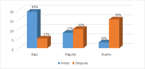 En esta figura podemos apreciar los niveles de la valoración de la coordinación motriz en niños de seis años de edad de educación general básica subnivel preparatorio, al inicio de la investigación los estudiantes presentan un nivel bajo de coordinación motriz con un valor del 63% del total de estudiantes, con un nivel regular del 27% y con un nivel bueno del 10%, al aplicar la gamificación como un método innovador en la educación física durante un bloque se pudo obtener resultados favorables en la coordinación motriz de los estudiantes expresadas con un nivel bueno del 50%, con un nivel regular del 35% y un nivel bajo del 17% del total de los niños. De una manera mas detallada se puede observar en la siguiente tabla.