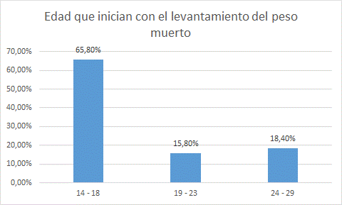 La edad para iniciar a hacer deportes varía dependiendo de este último, no obstante, la adolescencia definitivamente es una edad en la que la gran cantidad de deportistas de élite inician sus actividades deportivas. En el caso de los deportistas encuestados, se tiene que alrededor del 65% de ellos inició esta actividad deportiva (powerlifting) entre los 14 y 19 años de edad. Mientras que la restante tercera parte de ellos habría iniciado en el deporte luego de los 18 años.