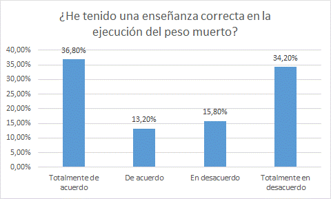 Sobre las enseñanzas en torno a las técnicas con las que se ejecuta el peso muerto, dentro del powerlifting, los encuestados mencionaron que solamente el 37%de ellos habría recibido una adecuada enseñanza temprana sobre la ejecución del peso muerto en el powerlifting.
