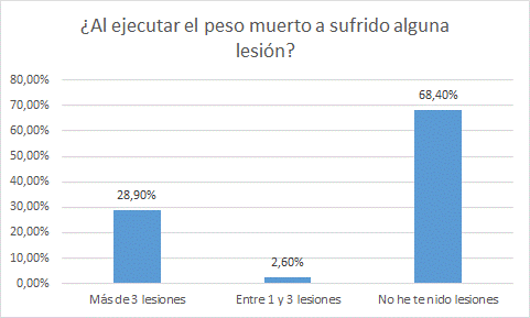Las lesiones son propias de todo deporte cuando no se toman las debidas precauciones, pero son más probables en deportes de fuerza. En este caso, según los encuestados, el 30% de ellos ha tenido al menos una lesión durante su experiencia como deportistas en la ejecución del peso muerto.