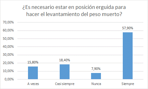 Sobre la necesidad de mantener ciertas posiciones a la hora de ejecutar un ejercicio de fuerza como el peso muerto, el 57% de los deportistas menciona que siempre es necesario mantenerse erguidos.