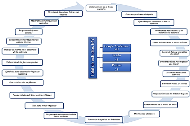 Los thesaurus de búsqueda y descriptores fueron: 1) Levantamientos olímpicos, 2) Fuerza explosiva, 3) Futbolistas juveniles, 4) Fútbol, 5) Halterófila, 6) Fuerza. Se filtró información por año de publicación entre el intervalo 2006 al 2020 basados en el ámbito del entrenamiento deportivo; agrupando los estudios clasificados por autor, año, revista y su respectiva descripción para que no exista documentos duplicados y represente un lineamiento de confiabilidad.
