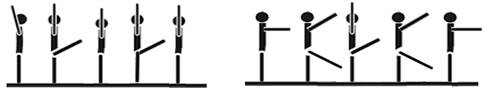 Posición inicial, con los brazos extendidos hacia arriba luego los brazos bajan y nuevamente suben, pero en esta ocasión el niño dará un solo paso y ese movimiento se repite constantemente, una de las variaciones que se pueden utilizar es que los brazos partan desde la extensión adelante hacia arriba repitiendo la secuencia de los pasos.