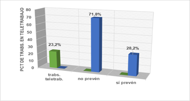 · Teniendo como base el estudio realizado en el interrogatorio se puede establecer que ha consecuencia del COVID-19, el 23,2% de los trabajadores de la MYPIMES, para evitar el contagio y preservar la vida, tuvieron que verse avocados a cumplir sus labores habituales mediante el teletrabajo. De estas empresas se observa que esta nueva modalidad de cumplimiento de sus labores mediante el teletrabajo para cuando finalice el COVID-19 predisponían que se refleja en un 28,2% frente al 71,8% que no prevén utilizar esta modalidad (Figura 1).