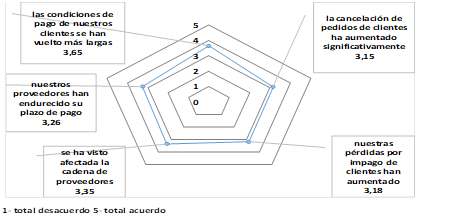 Con respecto a las relaciones con sus clientes los valores demuestran que se han visto afectadas negativamente las clientes han cancelado pedidos en un 3.15 (en una escala de 1 a 5), el poder de pago de los clientes se ha reducido y las perdidas por no pago por parte de sus clientes se han incrementado en 3,18 puntos en una escala de 1 a 5 (Figura 12).
