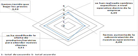 Con relación a las actividades operativas las empresas los mayores impactos se han presentado en las empresas que han tenido que realizar cambios operativos que les permita adaptarse a la nueva situación generada por el COVID, teniendo que modificar su oferta de servicios para captación de nuevos clientes e incluso bajar el precio de sus bienes y servicios. La subcontratación de sus operaciones presenta un valor por debajo de la escala de 2,28 puntos. (Figura 13).