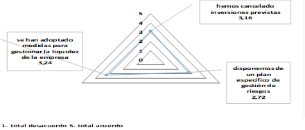 La crisis que ha generado el COVID-19 ha traído consigo la necesidad por parte de las MIPYMES en contar con nuevas estrategias para gestionar su liquidez con una valoración de 3,24 en una escala de 1 al 5, seguidamente se observa que las inversiones previstas han tenido que ser canceladas en 3.16 puntos, y una necesidad de contar con planes de gestión de riesgos de 2,72 puntos 3 en una escala de 1 a 5 (Figura 14).