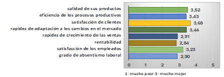El rendimiento de las empresas se midió mediante la utilización de indicadores que se construyeron a partir de la percepción del gerente encargado de dirigir la empresa en relación con su posición competitiva se preguntó. Se concluye que los tres aspectos que consideran más favorables las MIPYMES de Loja en una escala de 1: muy desfavorable a 5 muy favorable) son: aumento de la satisfacción de sus clientes con 3,70 puntos, seguido de la calidad de sus productos con 3,52 puntos y la necesidad de ajustar en el menor tiempo a los cambios en el mercado con 3,44 puntos. Los indicadores que han presentado datos menos beneficiosos son: rapidez en el crecimiento de las ventas con 2,91 puntos; grado de absentismo laboral con 2,90 puntos; y la rentabilidad de las MIPYMES con 2,84 puntos. (Figura 19)