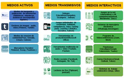 b) Los medios activos son los que permiten una actitud dinámica en el proceso educativo generando una experiencia enriquecedora mediante la reflexión como por ejemplo que son los que permiten generar un aprendizaje activo a través de recursos como traductores de idioma, herramientas de búsqueda.