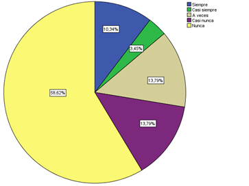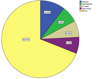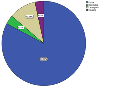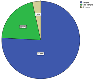 En la figura 1, se puede evidenciar que la mayor parte de los docentes con un porcentaje de 75,86%, se capacita constantemente en el ámbito educativo, lo que permite una mejora educativa en su institución mientras que en menor cantidad con un porcentaje del 3,45% solo se capacita a veces, por lo que en este grupo de docentes existiría menor conocimiento en nuevas enseñanzas,y metodologías; por lo tanto la falta de capacitación docente es un factor que influye para que haya desigualdad en el desempeño de un estudiante.
