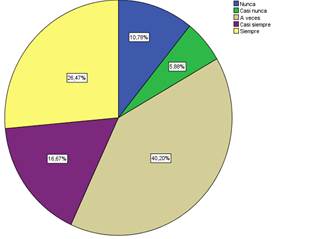 Esta pregunta fue realizada con el propósito de conocer si la emergencia sanitaria ha afectado la convivencia escolar entre los actores del proceso enseñanza-aprendizaje. Como resultado la figura 1 muestra que el 83,34% de los estudiantes Siempre, Casi siempre y A veces se sienten afectados por no frecuentar y relacionarse con sus amigos y docentes como lo hacían antes de la pandemia. A pesar que la Institución Educativa se ha ingeniado para llegar a cada hogar por diferentes medios de comunicación y mantener un ambiente cálido, el cambio a la educaión en línea ha generado una mayor limitación en la relación con sus compañeros y docentes, puesto que estar tras la cámara de un computador o un celular no es igual que estar en las aulas y patios de la escuela.