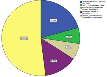 Cabe recalcar que a estos factores se añade la falta de organización para ejercer las diferentes labores en casa, por lo que muchas de las veces coinciden con el horario de clase causando desconcentración, pérdida de interés por lo que se está aprendiendo y estrés por la acumulación de tareas en casa y en la escuela. Aquella aspereza y preocupación puede desencadenar en la depresión por sentirse culpables de todo lo que sucede en casa y en la escuela, provocando hasta deseos de morir porque consideran que en sus actividades diarias siempre existen dificultades que no se sienten capaces de solucionar (Apaza et al. 2020).