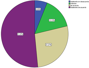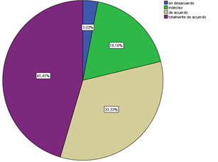 Se aprecia que sumando los porcentajes de frecuencia “de acuerdo” y “totalmente de acuerdo” en cuanto a una implementación permanente nos da un total de 78,79% teniendo un nivel de aceptación relativamente alto. En cuanto a la aceptación de que una CVA sea implementada en diversas temáticas sumando las mismas frecuencias nos da un total de 78,78% obteniendo un porcentaje alto evidenciando la incidencia que tuvo la CVA implementada, es menéster mencionar que la aceptación de una CVA en diversas temáticas la frecuencia “totalmente de acuerdo” corresponde a más de la mitad del porcentaje con respecto a la sumatoria de las frecuencias restantes.