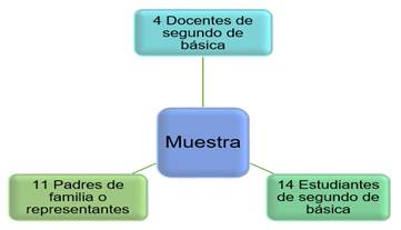 Por consiguiente, en relación a la muestra que representaron el universo, para esta investigación se seleccionó, a través de un muestreo conglomerado a 4 docentes de diferentes instituciones del cantón Gualaceo, exclusivamente del segundo año de básica, otra muestra utilizada en esta investigación fueron un grupo de 11 padres de familia o representantes y 14 estudiantes del segundo año correspondiendo a un muestreo estratificado, debido a que se requirió conocer las dificultades en el desarrollo de la lectoescritura en la modalidad virtual.