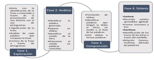 Fase 1. Exploración: esta fase responde a la primera etapa del método analítico, siendo la de comprender la frase o enunciado para relacionar con su entorno, se inicia desde la presentación de un cuento para identificar la frase o enunciado de estudio, donde se indentifica el número de palabras que tiene, se perfila cada palabra para conocer la forma de las letras y se lee la frase con apoyo de pictogramas, en este caso se puede aplicar cuentos interactivos con el uso de recursos tecnológicos, entre ellos Power Point y Geniality.