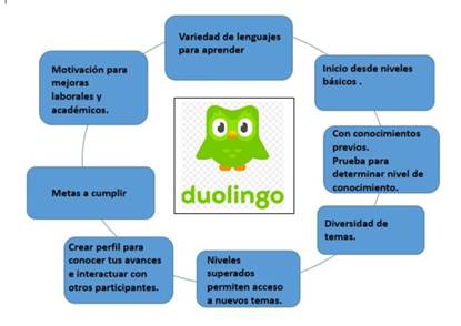 Figura 1. Estructura de la plataforma Duolingo como herramienta digital dentro de la CVA para el fortalecimiento de la lengua extranjera.