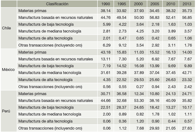Figura 3. Exportaciones de Chile, México y Perú a Estados Unidos por nivel tecnológico (%).