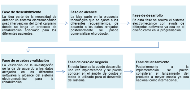 La definición de la propuesta tecnológica se efectuó con un análisis documental-bibliográfico, con un enfoque de tipo cuantitativo, es cuasi experimental. Se planteó como objetivo general definir un sistema de rehabilitación de motricidad post intervención por síndrome del túnel carpiano. Además, se apoyó con la metodología Stage Gate, la cual va de la mano con la gestión de innovación diseñada, que permite desarrollar diferentes actividades de un proceso las cuales son cinco puertas de validación y cinco etapas de avance, al aplicar la metodología un equipo multifuncional aprueba el paso por cada Etapa – Puerta, incrementando la tasa de éxito e implementado la toma de decisiones.