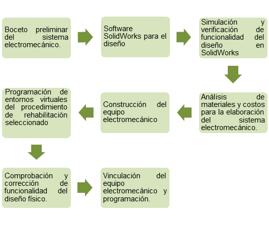 Asimismo, se, desarrollo el bosquejo teórico para el sistema electromecánico para la inducción de movimientos en la mano y dedos que permitan la ejecución de ejercicios, que cumplen con los movimientos considerados en el protocolo de rehabilitación establecidos para el caso.