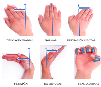 Selección del tipo de movimiento, todos los movimientos de la mano post intervención del STC parten de movimientos generales simples, estos movimientos se recuperan por medio de la rehabilitación después de haberlos perdido en la intervención por STC, se ha estudiado los procesos de rehabilitación medica donde se extrajo las secuencias que contengan los movimientos generales más acertados, buscando que los movimientos no requieran asistencia médica diaria. Los movimientos generales de la muñeca seleccionados son: flexión, extensión, desviación radial y desviación cubital. El movimiento de los dedos en agarre y semi agarre grupal, por otro lado, una secuencia dedo por dedo.