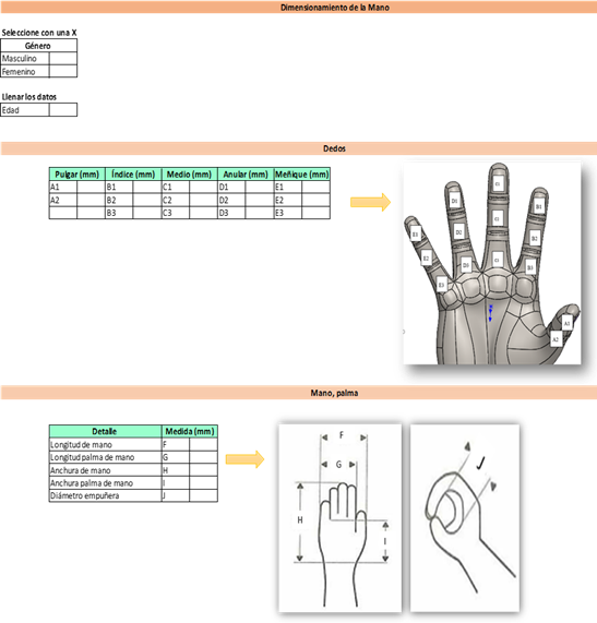 Protocolo y recolección de datos, la recolección de los datos de las medidas de las manos se efectuó en 23 personas donde se dio recomendaciones de cómo se debe realizar y llenar la base de datos con esto se obtendrá orden y a su vez permitirá obtener un máximo y mínimo con respecto a las medidas adquiridas.