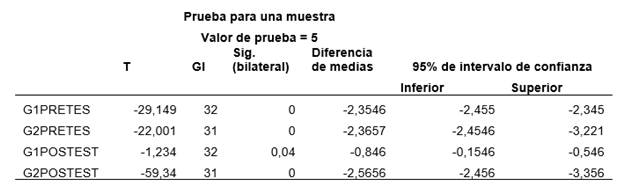 Se obtuvo un valor de significancia bilateral para el grupo experimental (G1POSTEST) en 0,04 se evidencia cambio estadístico en contraste con el resto de elementos, lo que indica que el programa aplicado surtió efecto en la población de estudio. Por lo tanto, se acepta H1 y se rechaza H0.