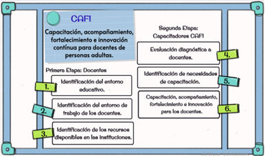 Capacitación, acompañamiento, fortalecimiento e innovación continua para docentes de personas adultas: Aplicación de la propuesta CAFI: Los capacitadores elaborarán las planificaciones adecuadas a las necesidades de los docentes, generarán cronogramas, recursos y desarrollarán las herramientas necesarias para la capacitación.