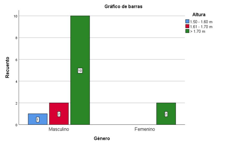 En el gráfico 2, del 100% de encuestados, con respecto al género masculino, en su mayoría con el 66,7% tiene una altura >1.70, mientras que el 13,3% entre 1.61 - 1.70 m, con el 6,7% entre 1.50 - 1.60 m de altura, por otro lado, el género femenino el 13,3% tiene > 1.70 m.