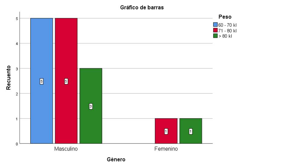 En el gráfico 3. del 100% de encuestados, con respecto al género masculino, el 33,3% pesa entre 60 - 70 kl, el otro 33,3% 71 - 80 kl, y con 20% 20,0%, por otro lado, el género femenino el 6,7% pesa entre 71 - 80 kl, el otro 6,7% > 80 kl.