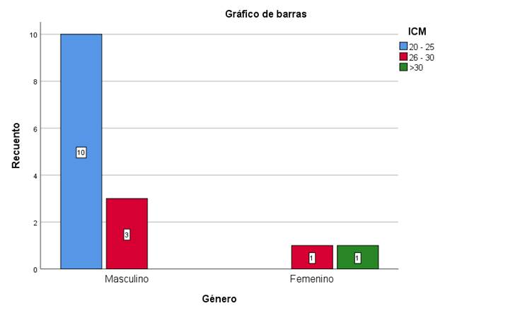 En el gráfico 4. del 100% de encuestados, con respecto al género masculino, el 66,7% presenta un índice de masa corporal entre 20 – 25, el 20% con ICM 26 – 30, por otro lado, en el género femenino el 6,7% con ICM 26 – 30, y finalmente el otro 6,7% con ICM >30.