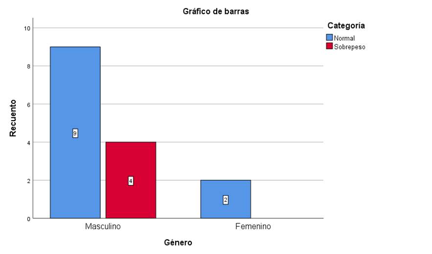 En el gráfico 5. del 100% de encuestados, con respecto al género masculino, el 60% tiene peso normal, el 26,7% sobrepeso, por otro lado, en el género femenino el 13,3% corresponde a un peso normal.
