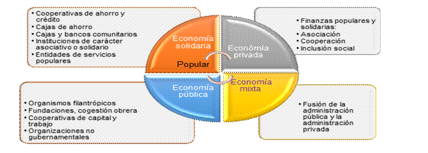 Bajo este contexto, la Asamblea Nacional Constituyente de Ecuador de 2007-2008 (ANC, 2008); y la, SEPS (2016) reconocen que las entidades que conforman el sistema financiero popular y solidario son las cooperativas de ahorro y crédito a nivel nacional, las cajas de ahorro que intermedien recursos del público, las cajas y bancos comunitarios, las instituciones de tipo asociativo o solidario, así como aquellas entidades que tienen finalidades de servicios populares en el sector financiero; la economía social y solidaria enfrenta el desafío de mantener principios y valores frente a una economía capitalista, se desenvuelve en un proceso de estructura social en la que la organización empresarial se orienta a solucionar necesidades y anhelos genuinos de los pueblos, comunidades, familias y socios.