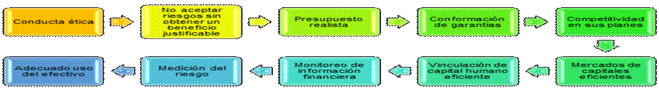 Las acciones básicas de la gestión financiera como se puede observar en la figura 2, se fundamentan en: mantener la integridad, objetividad, competencia y confidencialidad en un nivel óptimo de comportamiento ético; priorizar el retorno de la inversión con el menor riesgo posible a fin de obtener un mejor beneficio; procurar el aseguramiento de los recursos en un presupuesto realista que garantice sus utilizaciones; configurar garantías que aseguren a la entidad contra pérdidas e imprevistos operacionales; formular programas para enfrentar el entorno competitivo que surge en otros proyectos; colocar el capital para inversión y financiación a largo plazo que brinde productividad a la entidad.