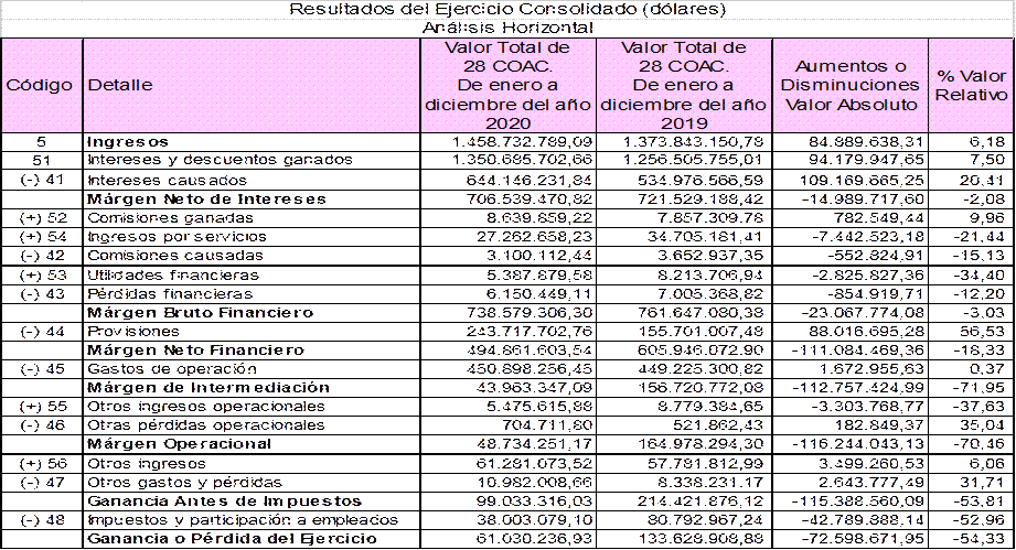 Del diagnóstico que se realizó a los estados financieros y resultados del ejercicio, mediante la aplicación de la técnica de análisis horizontal, se determinó que los gastos superaron en más de un 50% los ingresos en las COAC del segmento 1, disminuyendo sus excedentes en un -54,53% en el año 2020 con relación al año 2019, debido a los diversos cambios financieros que generó la incertidumbre de la pandemia.