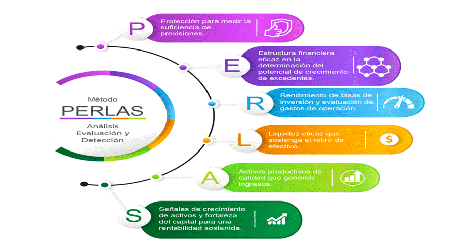 Richardson (2009), por su parte, precisa que existen diversas herramientas técnicas que valoran el desarrollo de las COAC, entre otros está el método “PERLAS”, este consiste en la aplicación de fórmulas e indicadores financieros de rendimiento y se identifican con cada letra de su nombre: protección, estructura financiera eficaz, calidad de activos, tasas de rendimiento y costos, liquidez y señales de crecimiento; orientados al análisis, evaluación y detección inmediata de las áreas problemáticas para corregir las deficiencias severas antes de que se vuelvan más graves; sus componentes utilizan un idioma universal que facilita su comprensión y comunicación, realizan clasificaciones objetivas y comparativas de la productividad corporativa y contribuyen a una eficaz supervisión en la credibilidad de la información para la Federación Nacional.