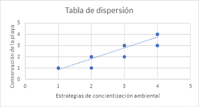 El valor estadístico r de Pearson es de 0,852852314, asimismo esta correlación es muy fuerte. Por lo que, se puede afirmar con 99% de confianza que en el ámbito de estudio hay una correlación positiva muy alta entre la variable estrategia de concientización ambiental y conservación de la playa. En tal sentido, las hipótesis planteadas para esta investigación se afirman, aceptándose que, a mayores estrategias de concientización ambiental, mayor es la conservación de la playa y, a mayor concientización ambiental de las personas que se benefician del balneario menor es la contaminación de la playa.