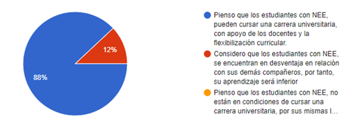 El 88% Piensan que los estudiantes con necesidades educativas específicas, pueden cursar una carrera universitaria, con apoyo de los docentes y la flexibilización curricular y el 12% Consideran que los estudiantes con NEE, se encuentran en desventaja en relación con sus demás compañeros, por tanto, su aprendizaje será inferior.